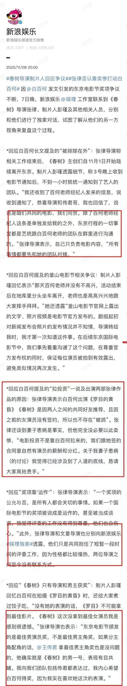 感觉《春树》的导演和制片人根本就不联系白百何,让她自己受气,然后各说各的,爱搭不理,其实制片和导演为了后续合作,应该找白百何方面说清楚事实,没必要写小作文搞拉锯战,感觉这是个策略,可能想炒作,把这部电影搞得人尽皆知,大家都会买票去看。其实如果没有扯清楚事实,制片方和导演没有给白百何道歉,可能这部电影命运也是崎岖,毕竟艺术片,和商业片不一样,很难被看好。