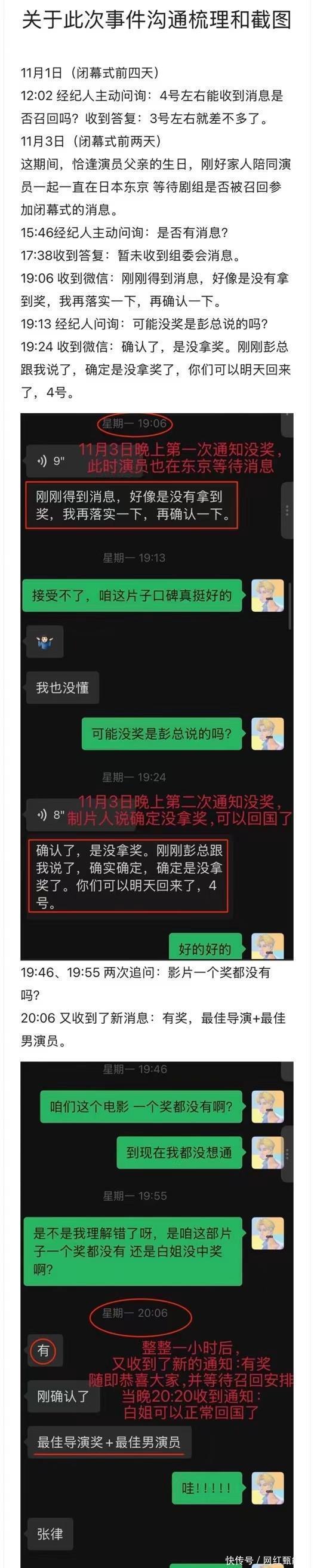 白百何方面进行回应,同时晒出聊天记录,的确知道获奖后安排白百何可以正常回国,不用参加电影节闭幕式,白百何也恭喜导演和王传君获奖,但白百何的确没获奖。好像都没有信息显示白百何要不要留下来参加电影节闭幕式?
