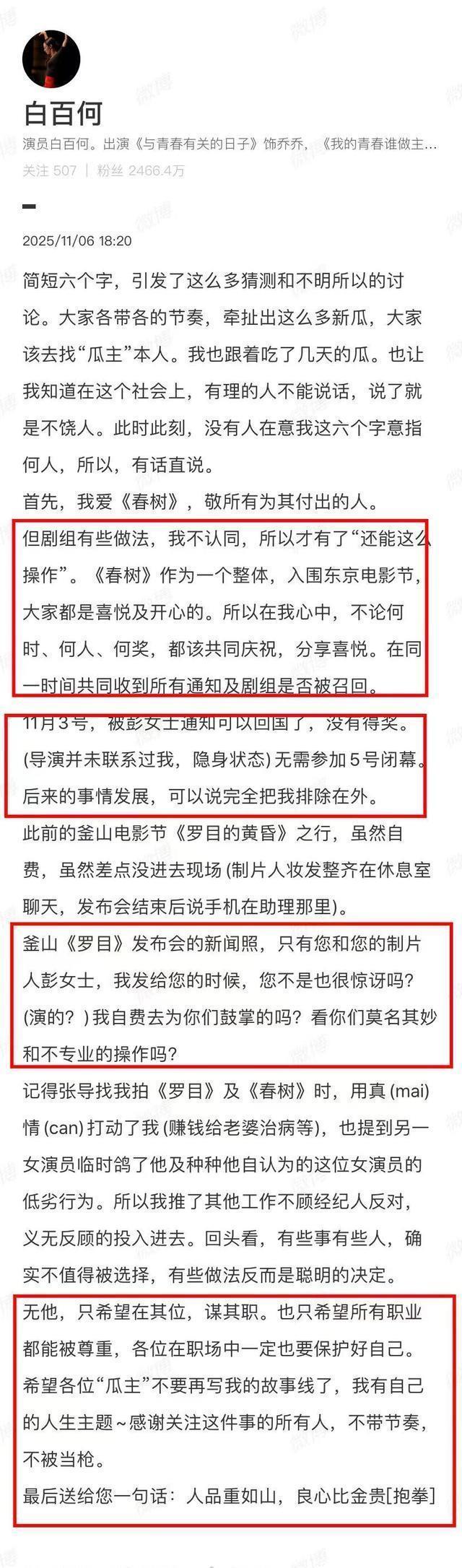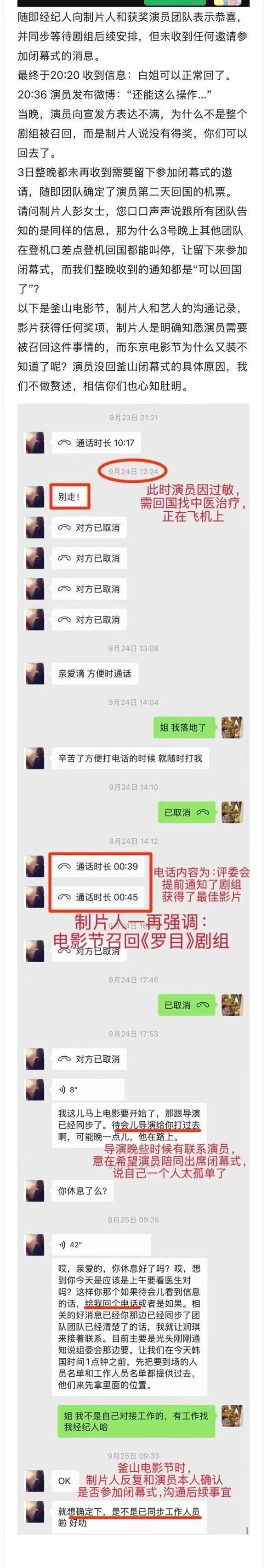 感觉这些时间线的曝光,片方制片和导演似乎都不是很专业,不重视沟通问题,导致白百何可能就不是很爽,难怪在朋友圈发文得鱼忘筌的漫画,还表示被“过河拆桥”,白百何一定很不高兴,自己辛苦在两部电影里表演,《罗目的黄昏》获得最佳影片,一直联系白百何一定要参加走闭幕式红毯,但是到了东京电影节,因为白百何没有得奖,制片就让白百何单独回国了,所以整个表现过程都有问题。 《春树》是大女主戏,白百何是贡献者之一,导演能够获奖也离不开白百何精彩的表演吧? 白百何为什么不高兴,而且她有自己的团队,工作事宜都是和具体工作人员联系,所以片方可能都没有主动承认做事不细致到位,让白百何感到寒心,自己付出得不到回报。戏拍完了,女主演不出席电影节闭幕式,的确说不过去,给人的感觉是女主角没获奖,所以不高兴回国的感觉?